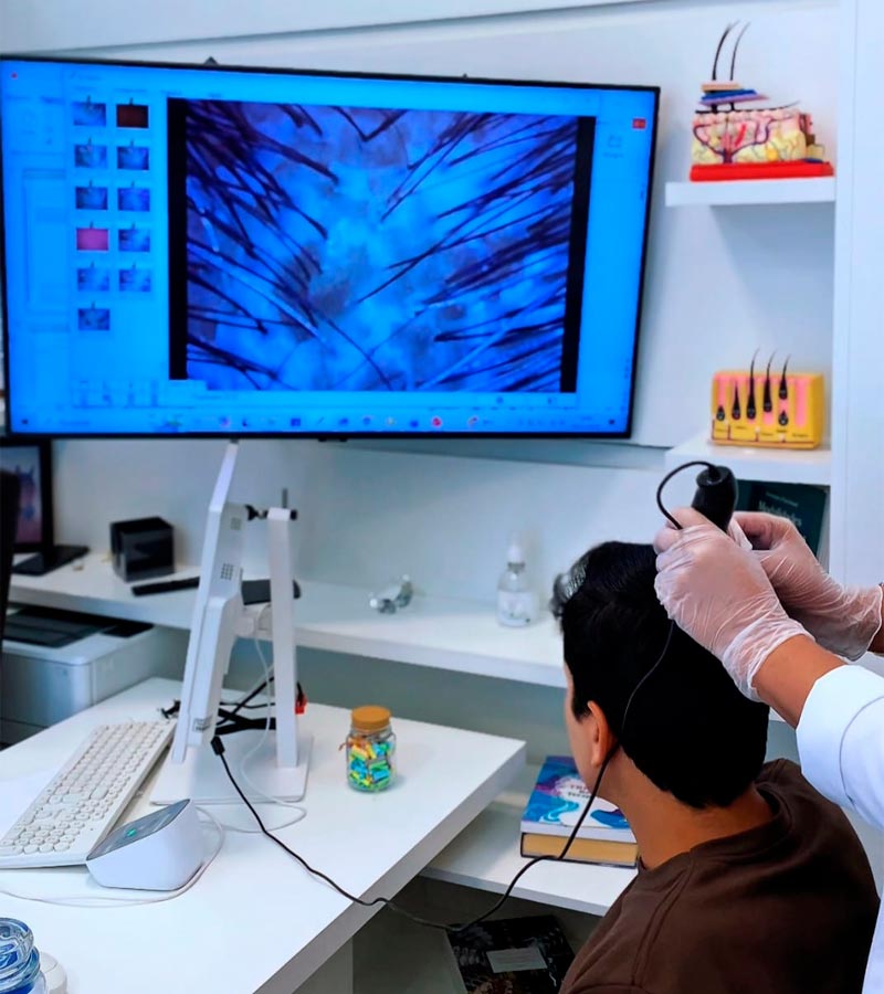 • Tricoscopia Digital: Exame de imagem que permite ver microscopicamente o couro cabeludo e fios.
